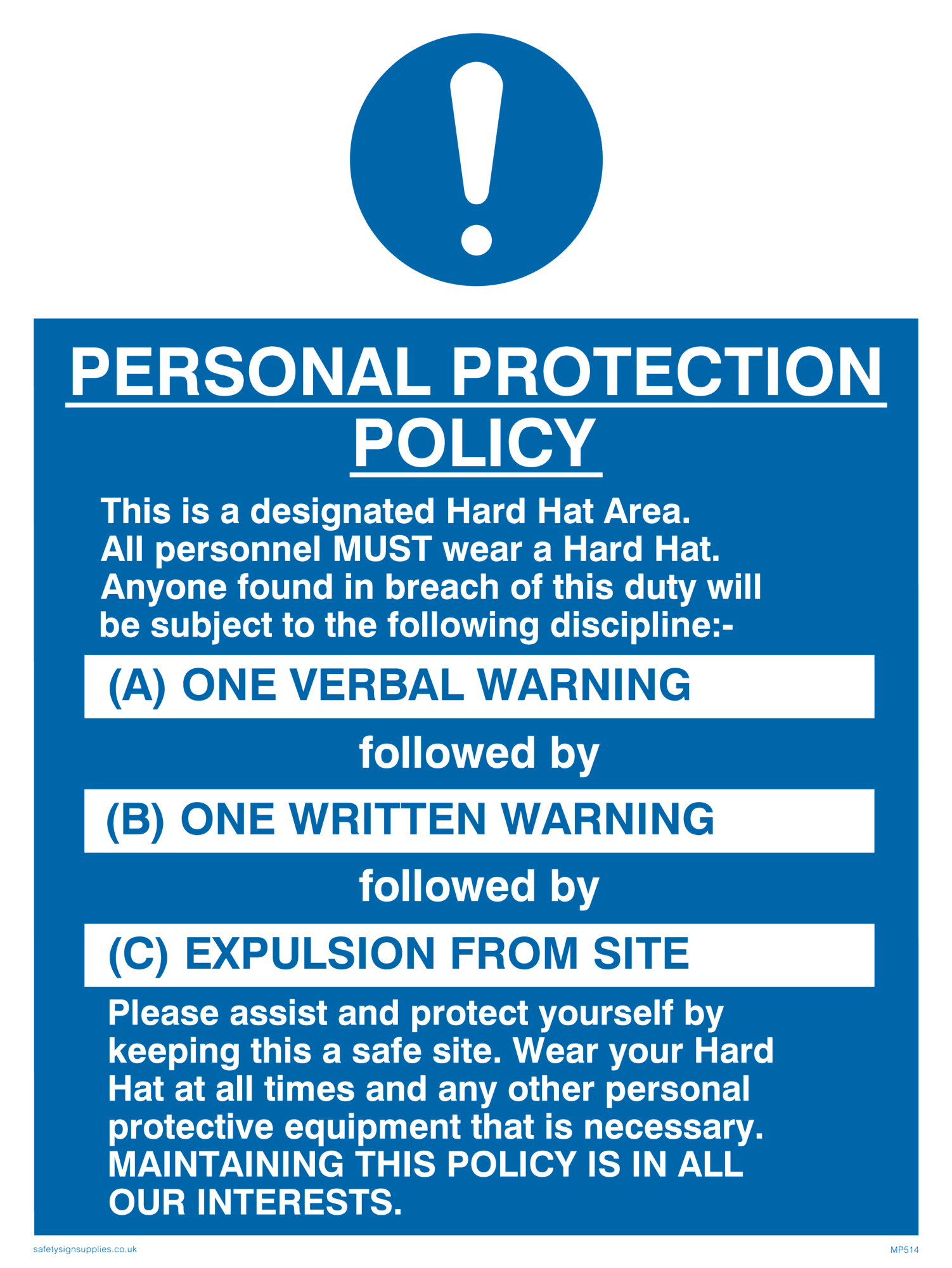 This sign contains a general Mandatory Exclamation Symbol - exclamation mark in white on blue circle background.