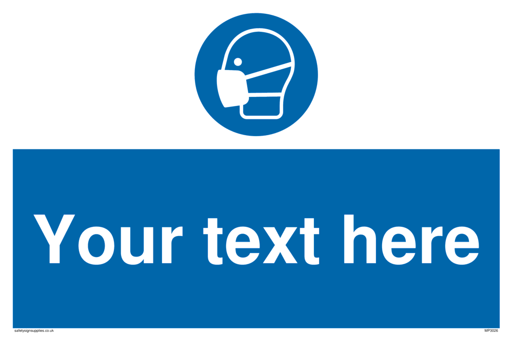 This sign contains a face mask required symbol - person wearing a face mask in white within blue circle.