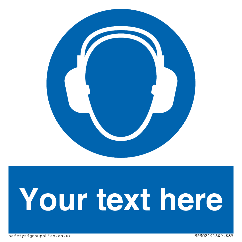 Custom mandatory ear protection sign with ear protection must be worn symbol - man wearing ear protection in white in blue circle