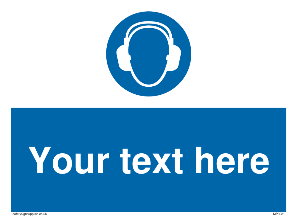 This sign contains an ear protection required symbol - person wearing ear defenders in white within blue circle.