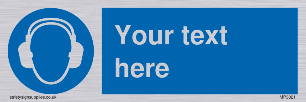 This sign contains an ear protection required symbol - person wearing ear defenders in white within blue circle.