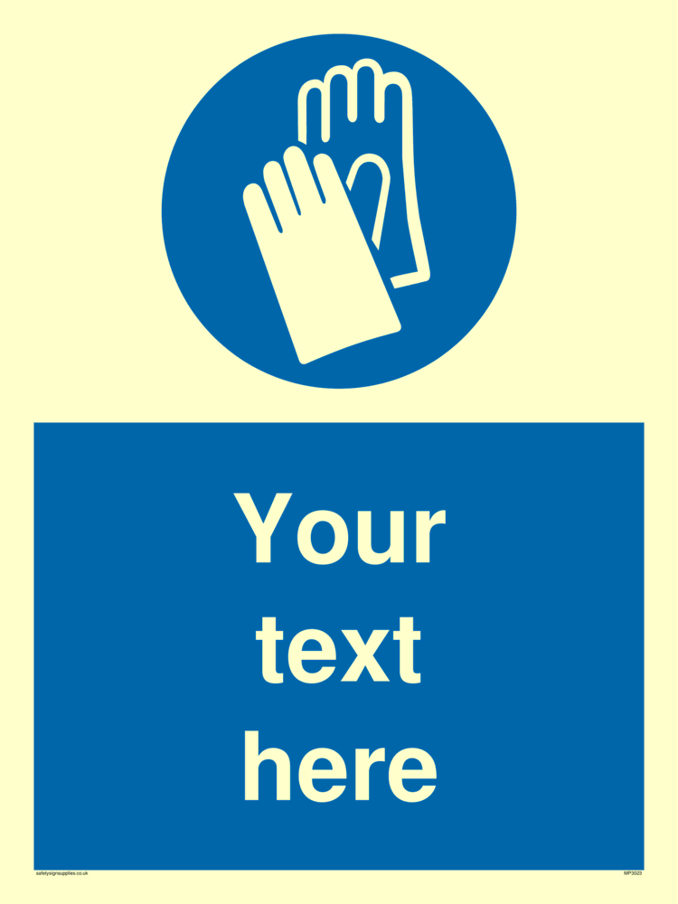This sign contains a protective gloves required symbol - gloves in white within blue circle.