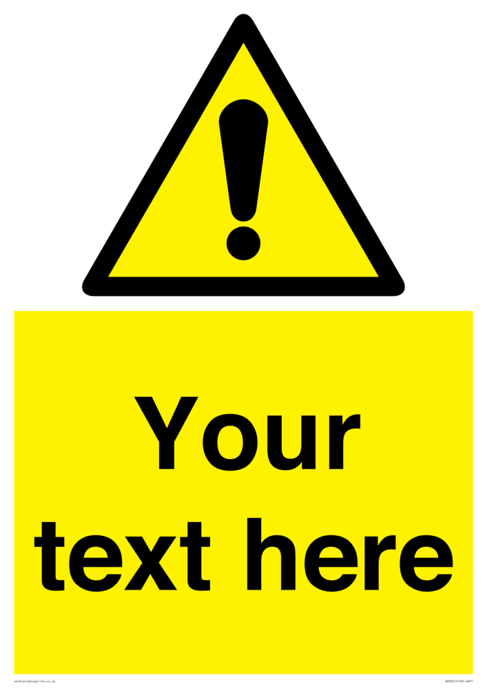 Custom warning safety sign with warning symbol - black exclamation in yellow triangle.