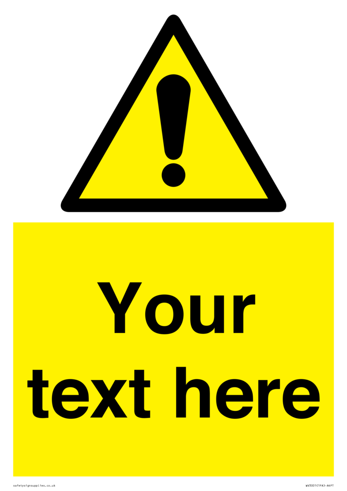 Custom warning safety sign with warning symbol - black exclamation in yellow triangle.