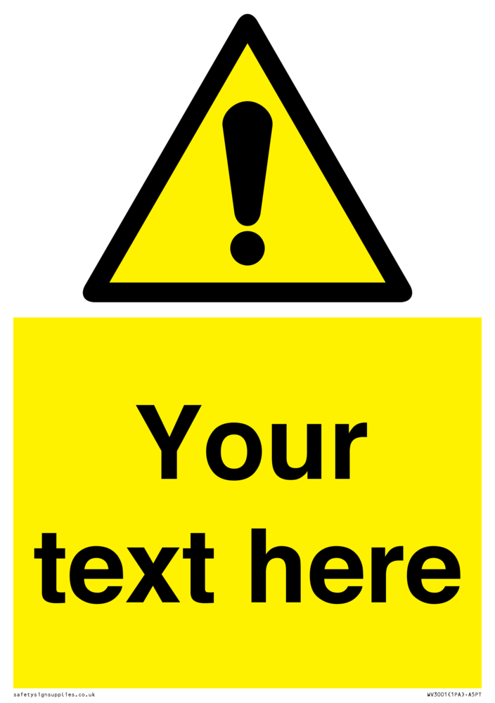 Custom warning safety sign with warning symbol - black exclamation in yellow triangle.