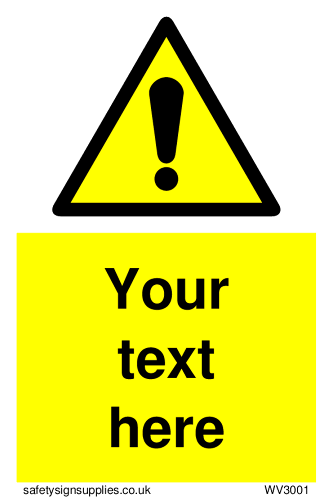 Custom warning safety sign with warning symbol - black exclamation in yellow triangle.