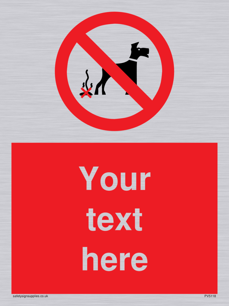 Custom No Dog Fouling Sign. Add your own custom text. Normal delivery times apply. Red No Dog Fouling Symbol. This symbol and sign layout complies with new EN7010 legislation that governs safety signs.