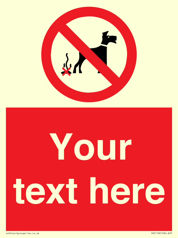 Custom No Dog Fouling Sign. Add your own custom text. Normal delivery times apply. Red No Dog Fouling Symbol. This symbol and sign layout complies with new EN7010 legislation that governs safety signs.