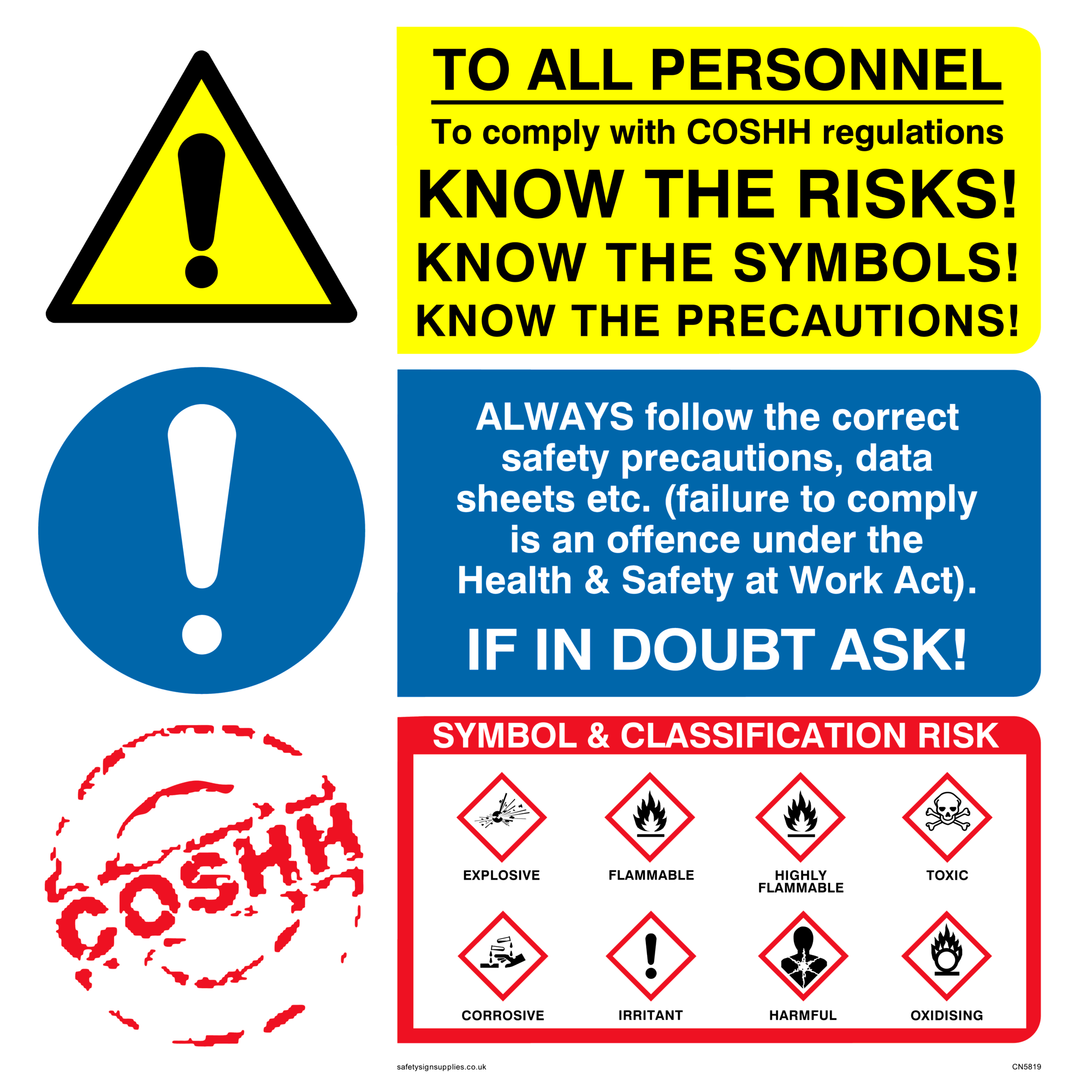 A combination sign combines several safety sign types on one sign. Control of substances hazardous to health (COSHH) signs warn of a potential danger from a substance and the mandatory actions to prevent or minimise the risk of harm. This sign is extra large. Signs in this range are from our maximum choice range. Giving you the most choice of signs available in the UK.