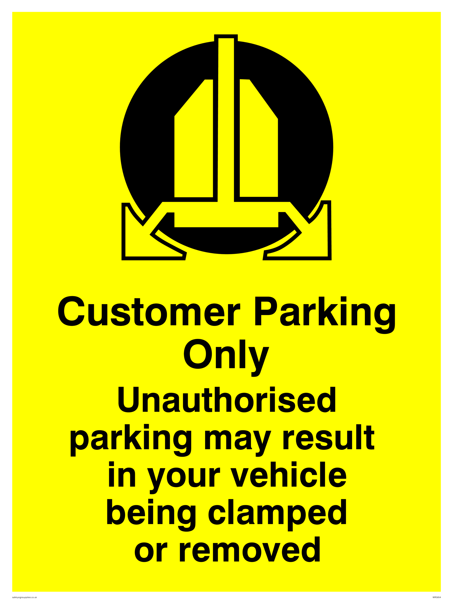 This signs contains a wheel clamp symbol. Wheel in clamp in black. Comes with a self adhesive backing.