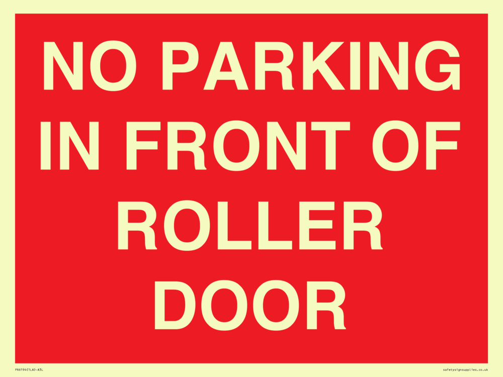 Sign Text: NO PARKING IN FRONT OF ROLLER DOOR