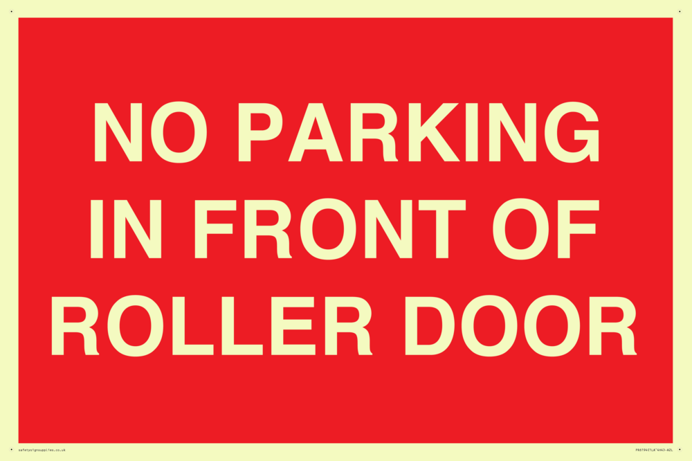 Sign Text: NO PARKING IN FRONT OF ROLLER DOOR