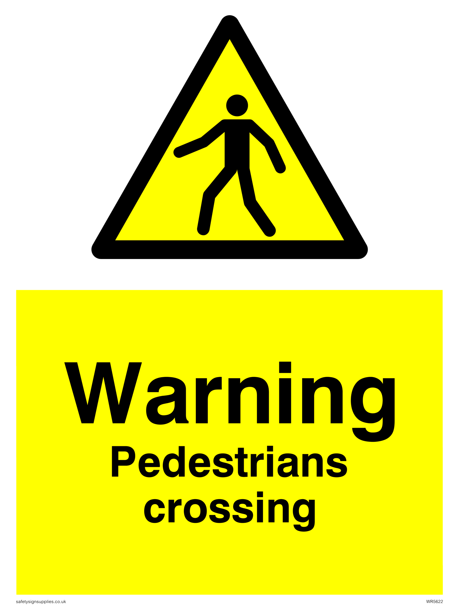 This sign contains a warning pedestrian symbol. Person walking in black within yellow triangle.