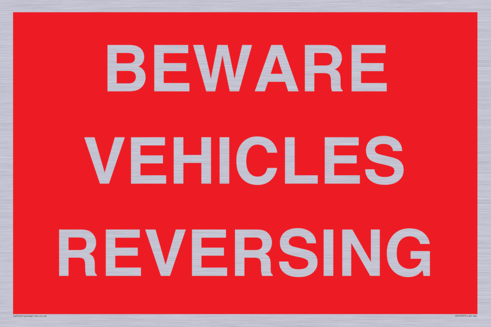Sign Text: BEWARE VEHICLES REVERSING Product Type: Prohibition Safety Signs Dimensions: 600x400mm Material: Brushed silver aluminum with 2 channel Orientation: Landscape Text Colour: White More...