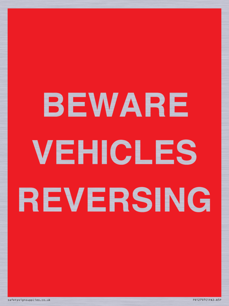 Sign Text: BEWARE VEHICLES REVERSING Product Type: Prohibition Safety Signs Dimensions: 150x200mm Material: Brushed silver aluminum with 1 channel add X50CLIP1 to your basket for fixing Orientation: Portrait Text Colour: White More...