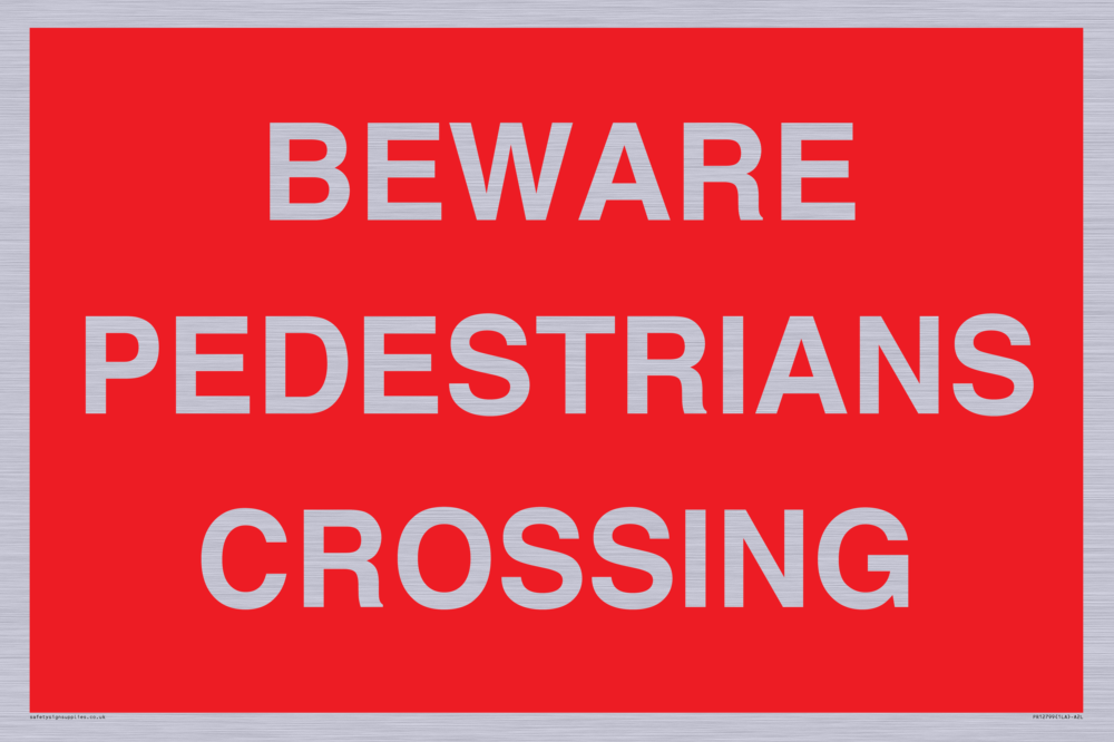 Sign Text: BEWARE PEDESTRIANS CROSSING Product Type: Prohibition Safety Signs Dimensions: 600x400mm Material: Brushed silver aluminum with 2 channel Orientation: Landscape Text Colour: White More...