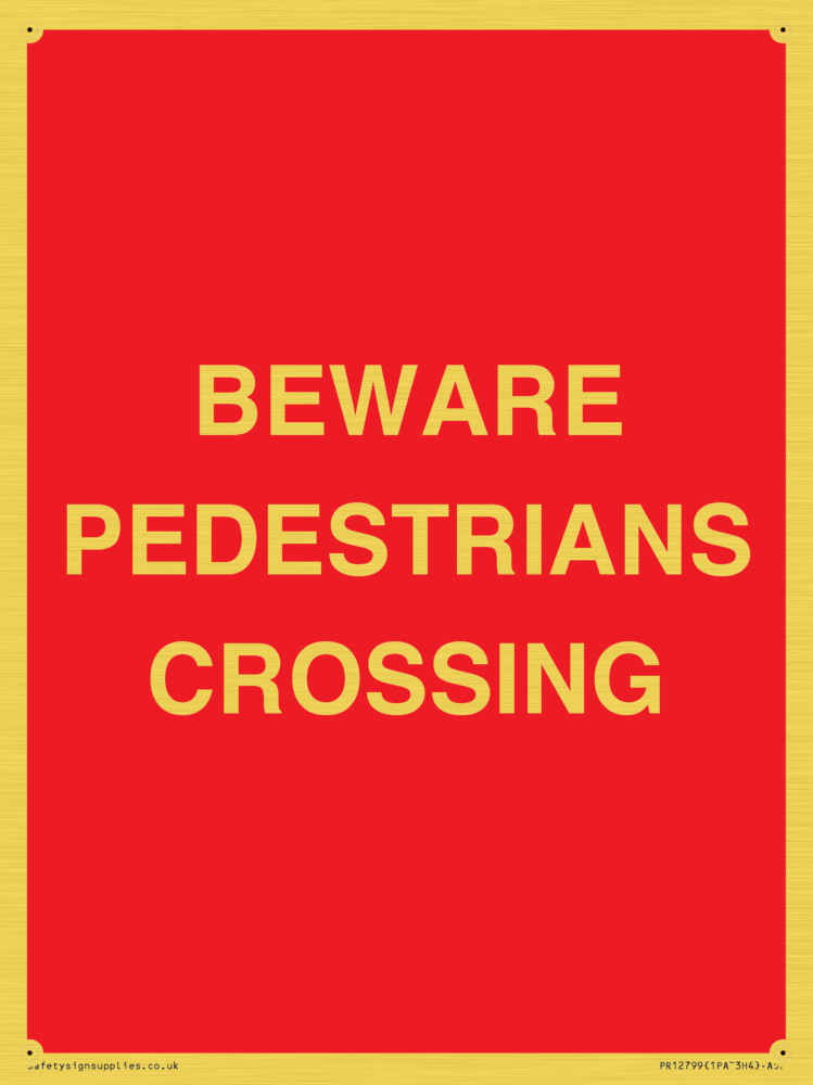 Sign Text: BEWARE PEDESTRIANS CROSSING