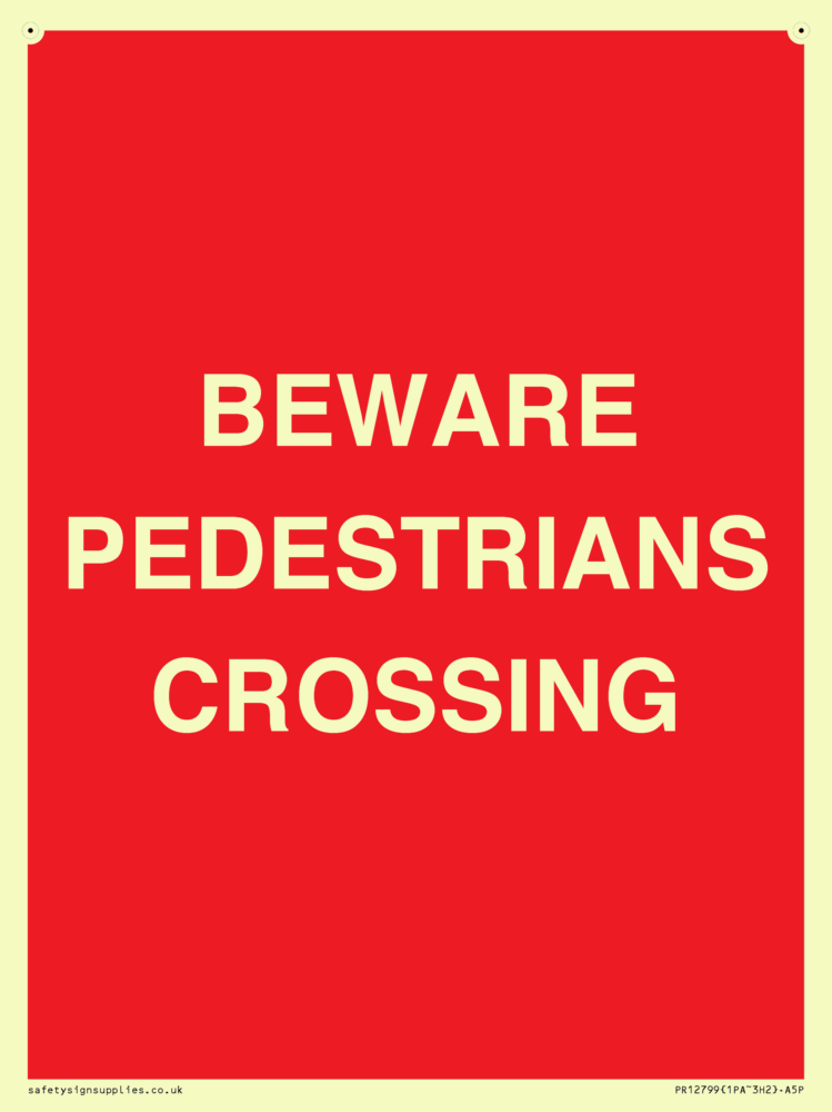 Sign Text: BEWARE PEDESTRIANS CROSSING