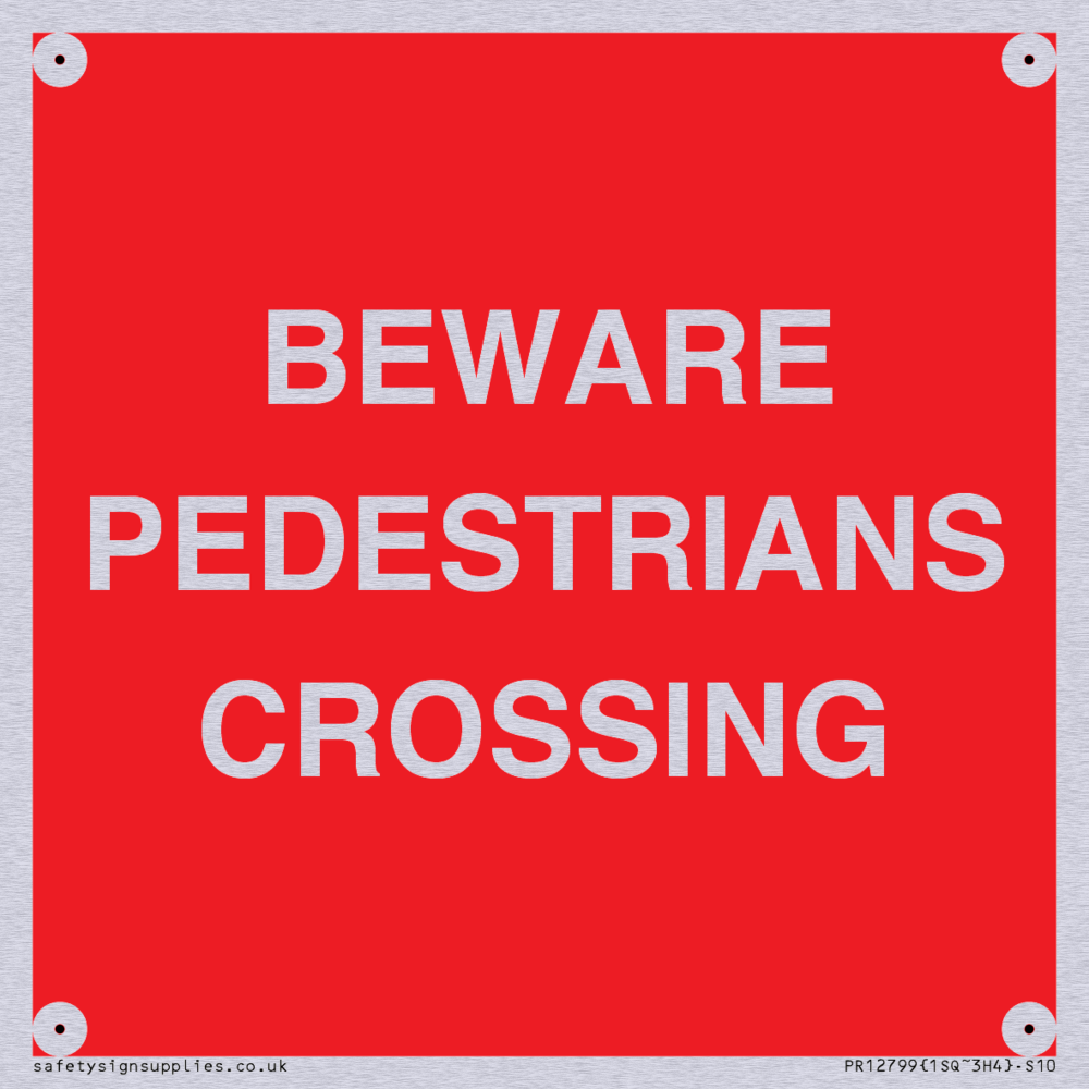 Sign Text: BEWARE PEDESTRIANS CROSSING