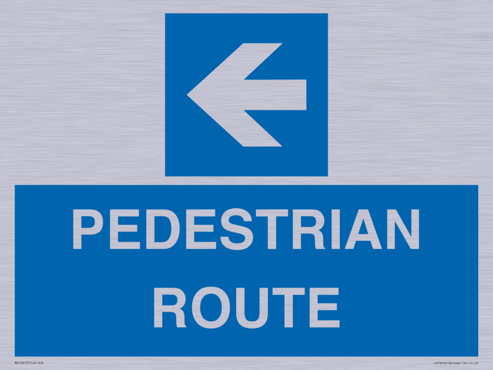 Sign Text: PEDESTRIAN ROUTE Dimensions: 400x300mm Material: Brushed silver aluminum with 2 channel Orientation: Landscape Text Colour: White Background Colour: Blue More...