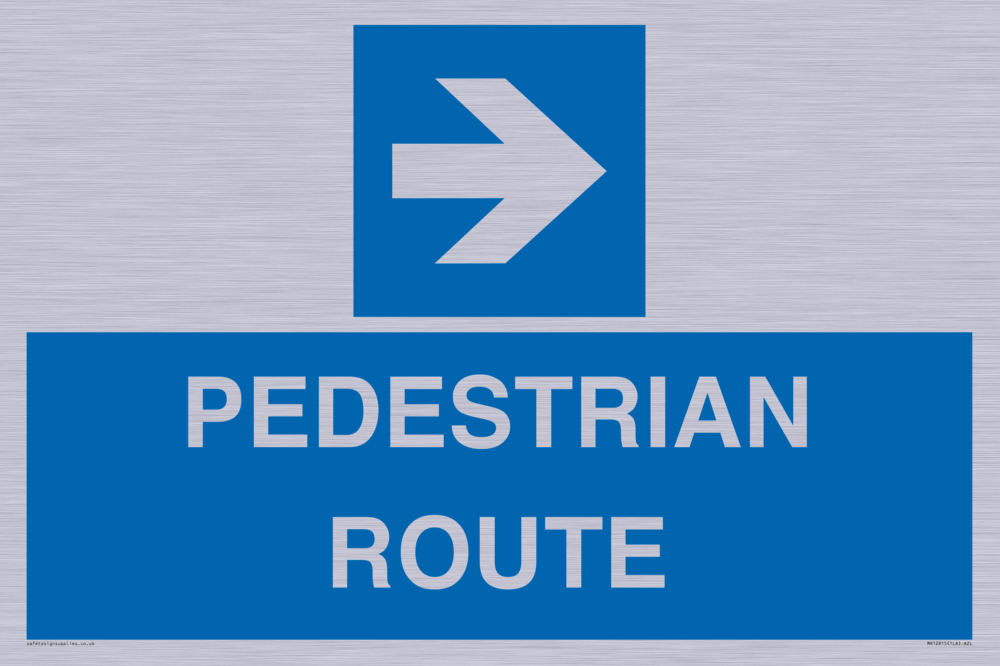 Sign Text: PEDESTRIAN ROUTE Dimensions: 600x400mm Material: Brushed silver aluminum with 2 channel Orientation: Landscape Text Colour: White Background Colour: Blue More...