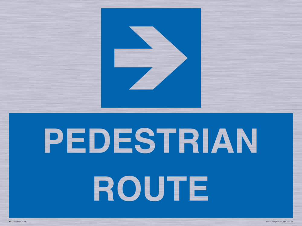 Sign Text: PEDESTRIAN ROUTE Dimensions: 400x300mm Material: Brushed silver aluminum with 2 channel Orientation: Landscape Text Colour: White Background Colour: Blue More...