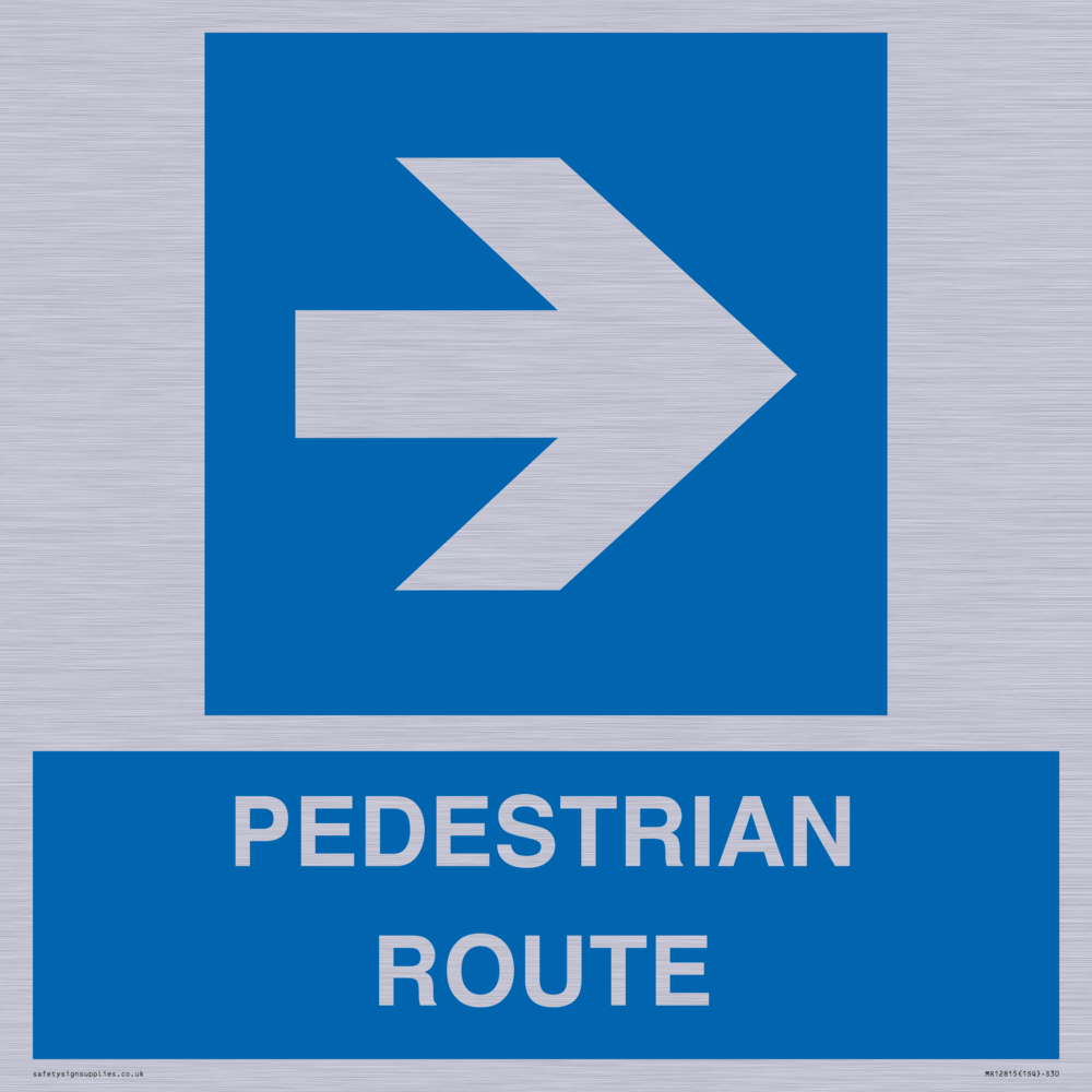 Sign Text: PEDESTRIAN ROUTE Dimensions: 300x300mm Material: Brushed silver aluminum with 2 channel Orientation: Square Text Colour: White Background Colour: Blue More...