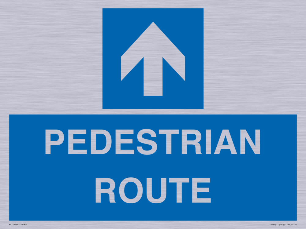 Sign Text: PEDESTRIAN ROUTE Dimensions: 400x300mm Material: Brushed silver aluminum with 2 channel Orientation: Landscape Text Colour: White Background Colour: Blue More...