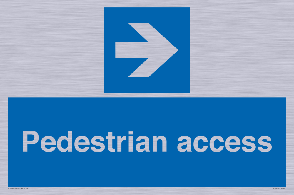 Sign Text: Pedestrian access Dimensions: 600x400mm Material: Brushed silver aluminum with 2 channel Orientation: Landscape Text Colour: White Background Colour: Blue More...