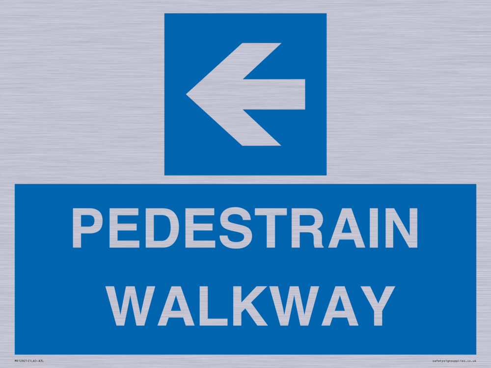 Sign Text: PEDESTRAIN WALKWAY Dimensions: 400x300mm Material: Brushed silver aluminum with 2 channel Orientation: Landscape Text Colour: White Background Colour: Blue More...