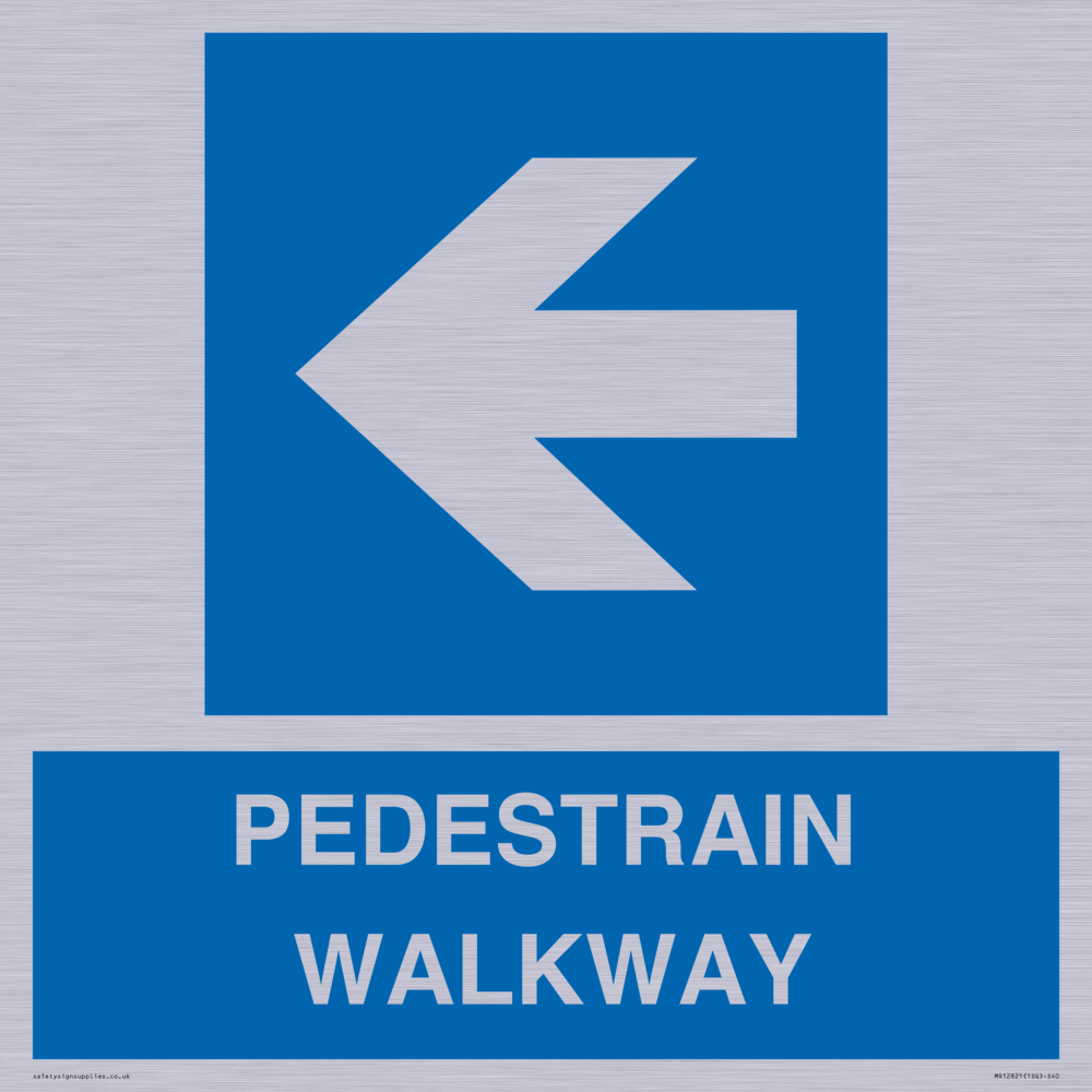 Sign Text: PEDESTRAIN WALKWAY Dimensions: 400x400mm Material: Brushed silver aluminum with 2 channel Orientation: Square Text Colour: White Background Colour: Blue More...