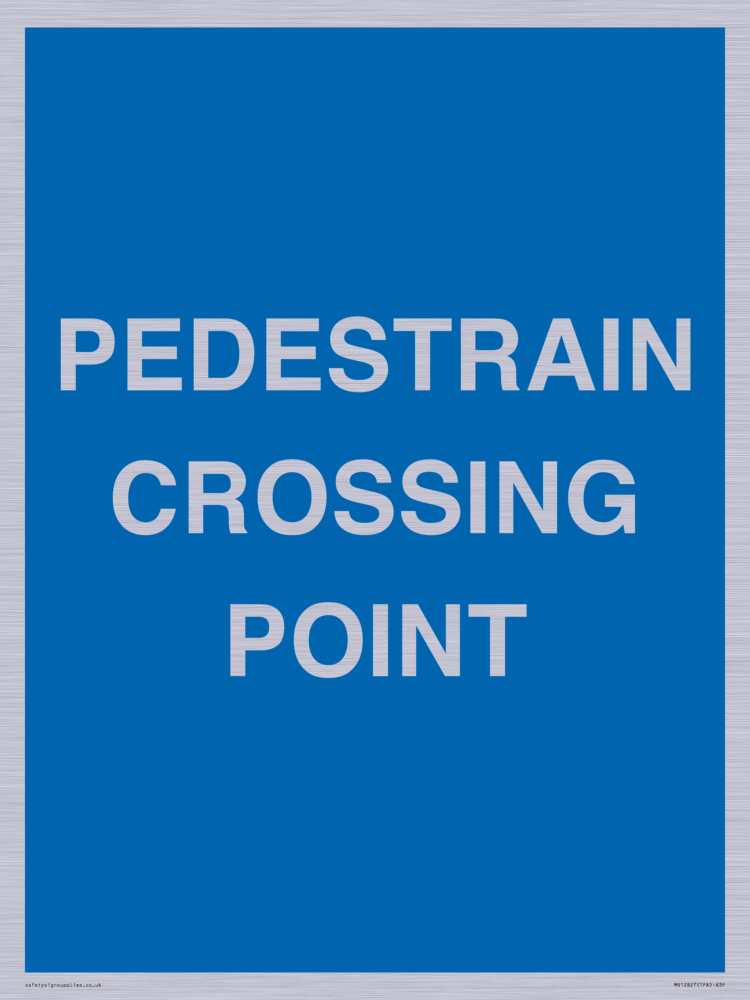 Sign Text: PEDESTRAIN CROSSING POINT Dimensions: 300x400mm Material: Brushed silver aluminum with 2 channel Orientation: Portrait Text Colour: White Background Colour: Blue More...