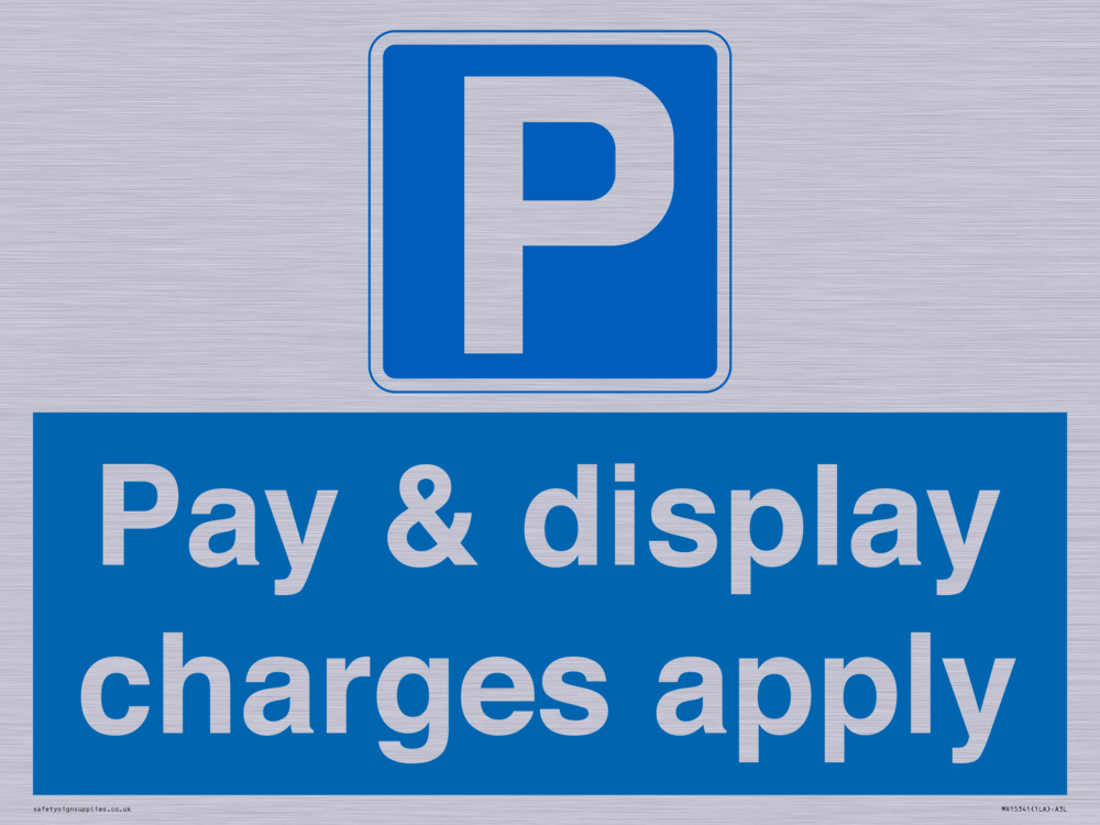 Sign Text: Pay & display charges apply Dimensions: 400x300mm Material: Brushed silver aluminum with 2 channel Orientation: Landscape Text Colour: White Background Colour: Blue More...