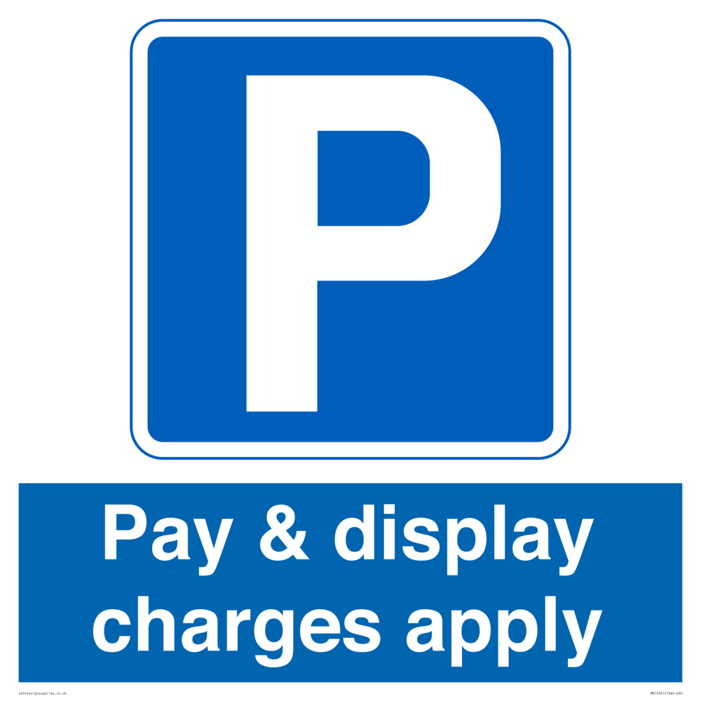 Sign Text: Pay & display charges apply Dimensions: 600x600mm Material: Aluminum with 2 channels Orientation: Square Text Colour: White Background Colour: Blue More...