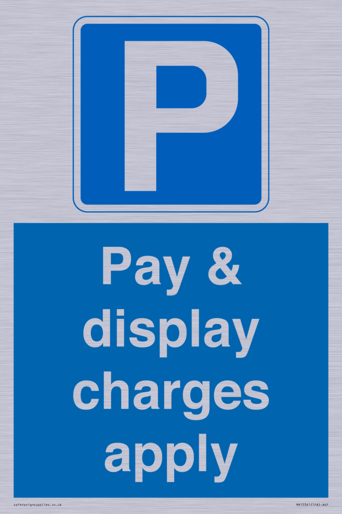 Sign Text: Pay & display charges apply Dimensions: 200x300mm Material: Brushed silver aluminum with 2 channel Orientation: Portrait Text Colour: White Background Colour: Blue More...