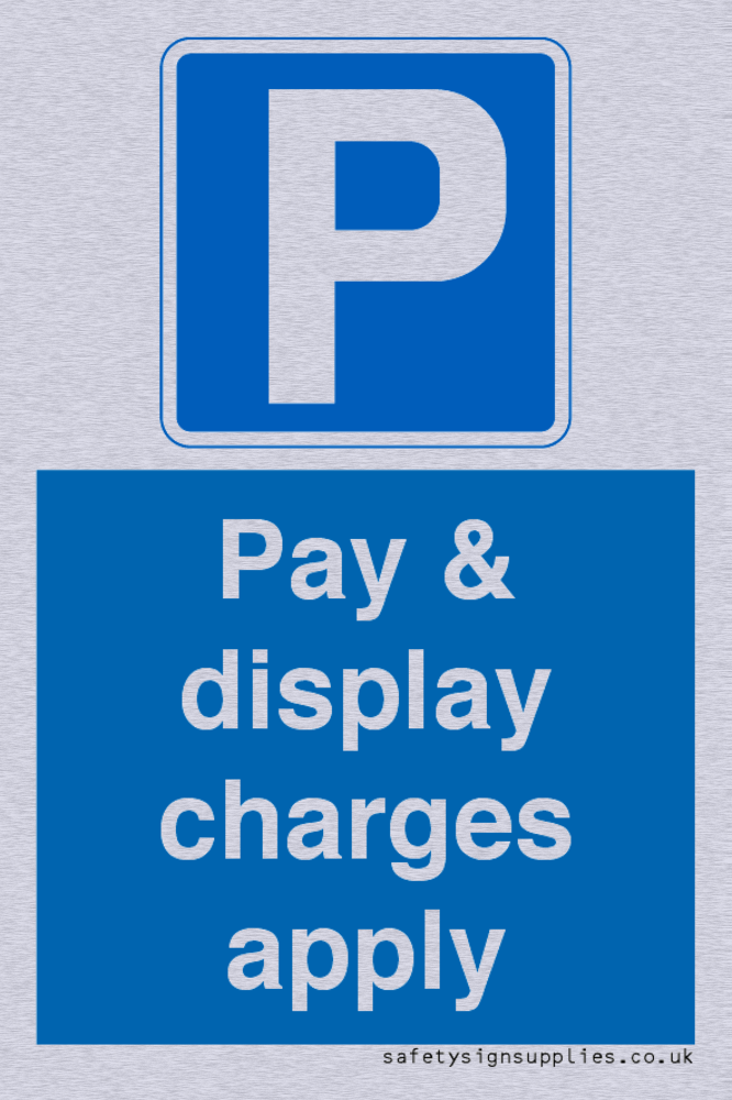 Sign Text: Pay & display charges apply Dimensions: 50x75mm Material: Satin Silver Aluminium Orientation: Portrait Text Colour: White Background Colour: Blue More...