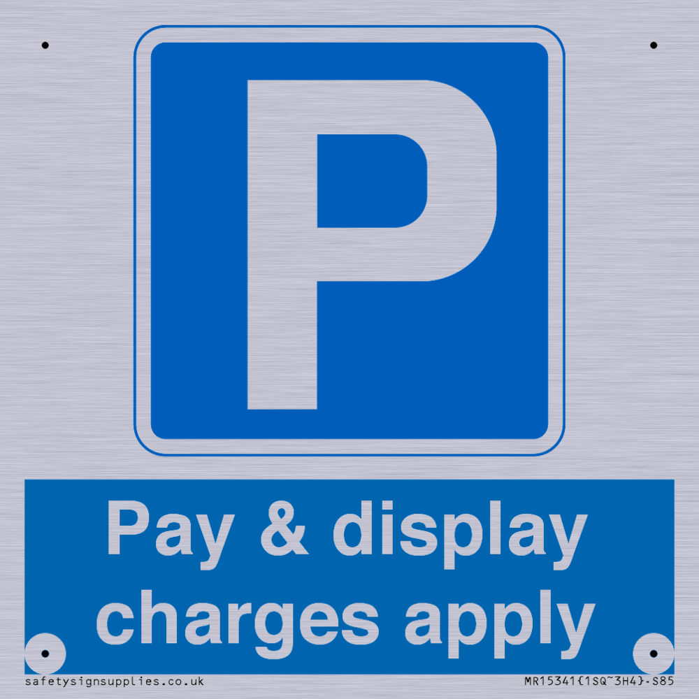 Sign Text: Pay & display charges apply Dimensions: 85x85mm Material: Grained Silver Aluminium Orientation: Square Text Colour: White Background Colour: Blue More...