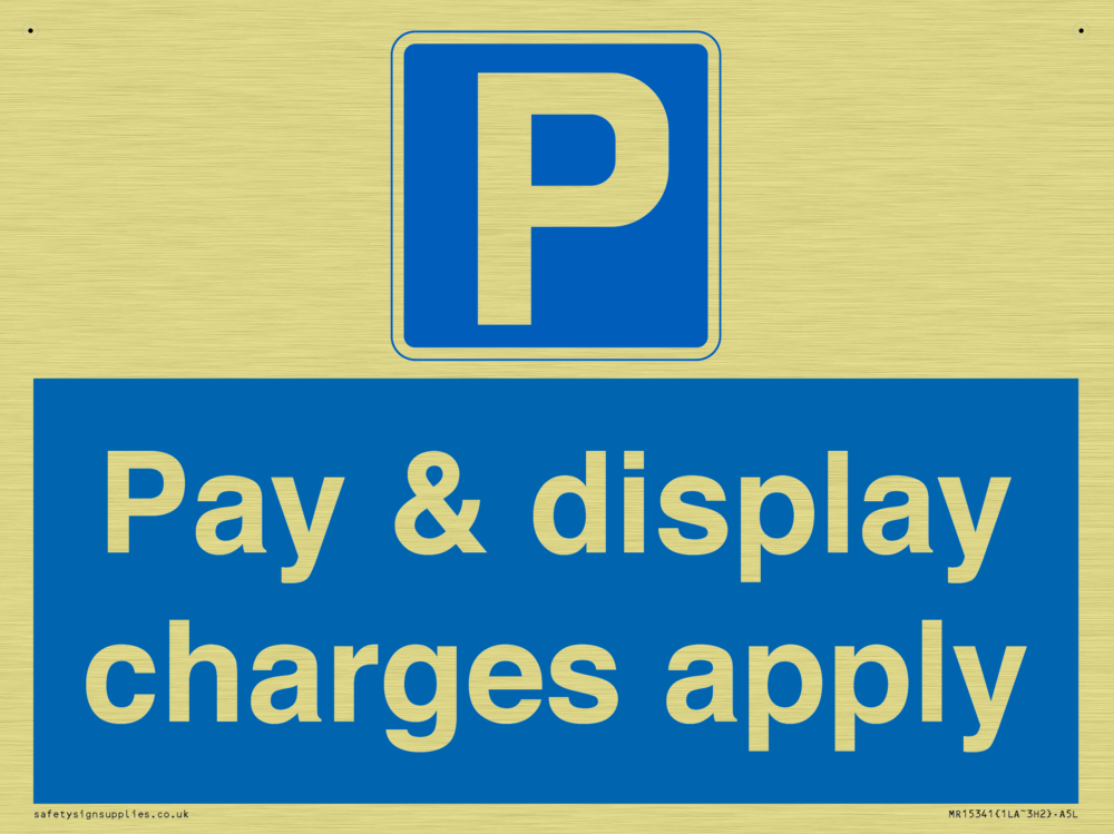 Sign Text: Pay & display charges apply Dimensions: 200x150mm Material: Champagne Aluminium Orientation: Landscape Text Colour: White Background Colour: Blue More...