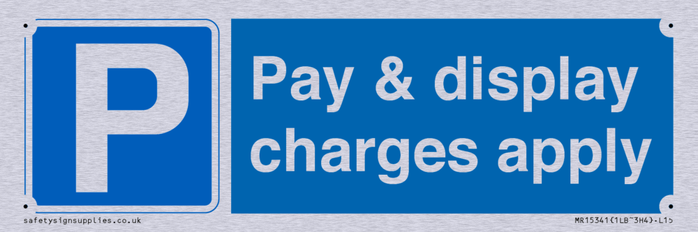 Sign Text: Pay & display charges apply Dimensions: 150x50mm Material: Satin Silver Aluminium Text Colour: White Background Colour: Blue Thickness / Depth: 0.7mm More...