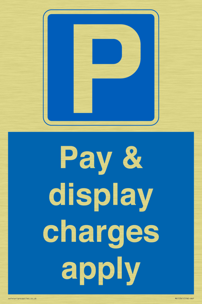 Sign Text: Pay & display charges apply Dimensions: 200x300mm Material: Champagne Aluminium Orientation: Portrait Text Colour: White Background Colour: Blue More...
