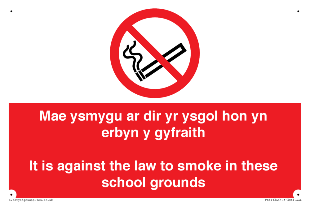 Sign Text: Mae ysmygu ar dir yr ysgol hon yn erbyn y gyfraith It is against the law to smoke in these school grounds