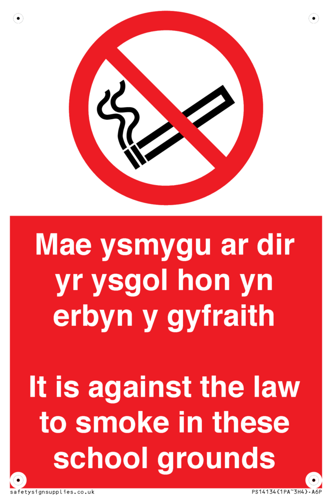 Sign Text: Mae ysmygu ar dir yr ysgol hon yn erbyn y gyfraith It is against the law to smoke in these school grounds