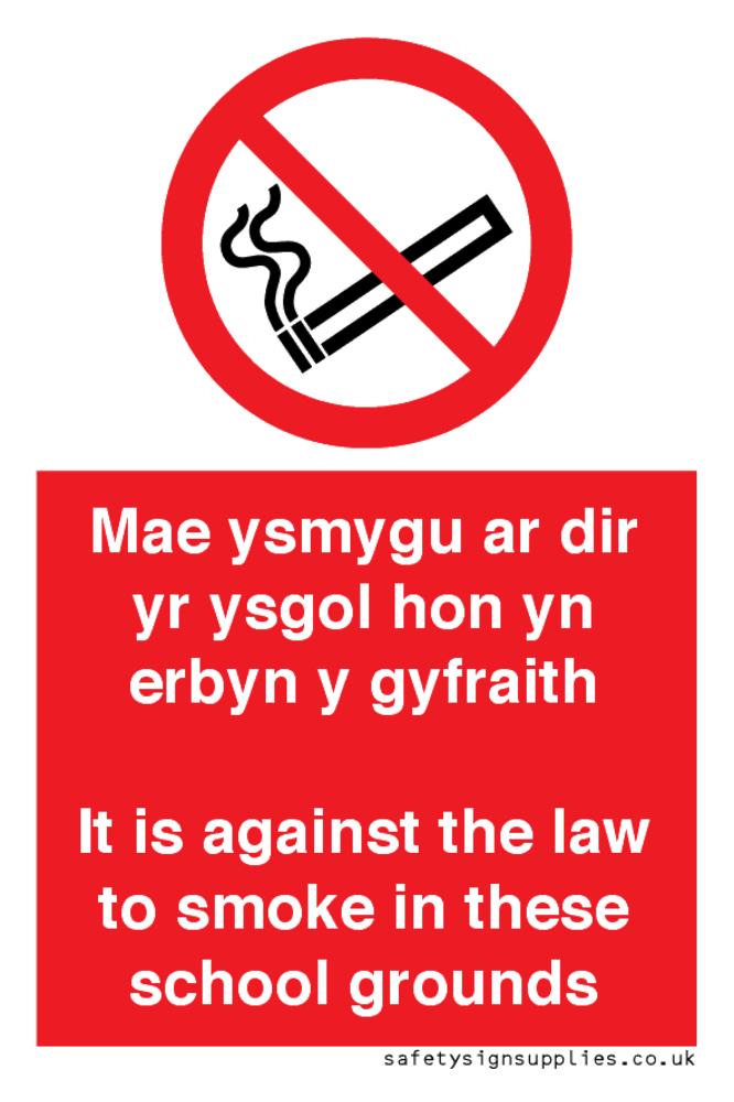 Mae ysmygu ar dir yr ysgol hon yn erbyn y gyfraith It is against the law to smoke in these school grounds - Bilingual Welsh / English