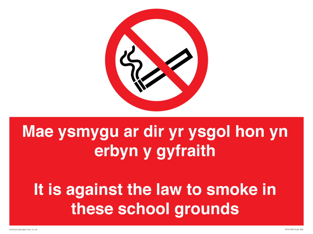 Mae ysmygu ar dir yr ysgol hon yn erbyn y gyfraith It is against the law to smoke in these school grounds - Bilingual Welsh / English