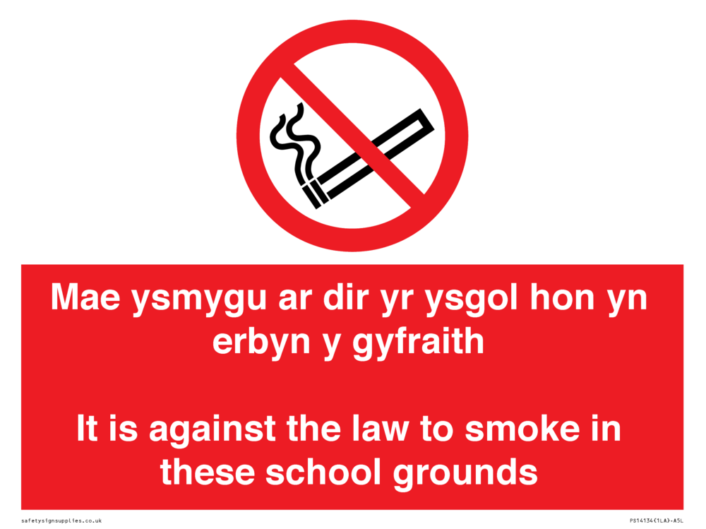 Mae ysmygu ar dir yr ysgol hon yn erbyn y gyfraith It is against the law to smoke in these school grounds - Bilingual Welsh / English