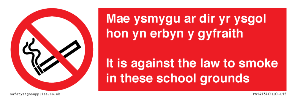 Mae ysmygu ar dir yr ysgol hon yn erbyn y gyfraith It is against the law to smoke in these school grounds - Bilingual Welsh / English