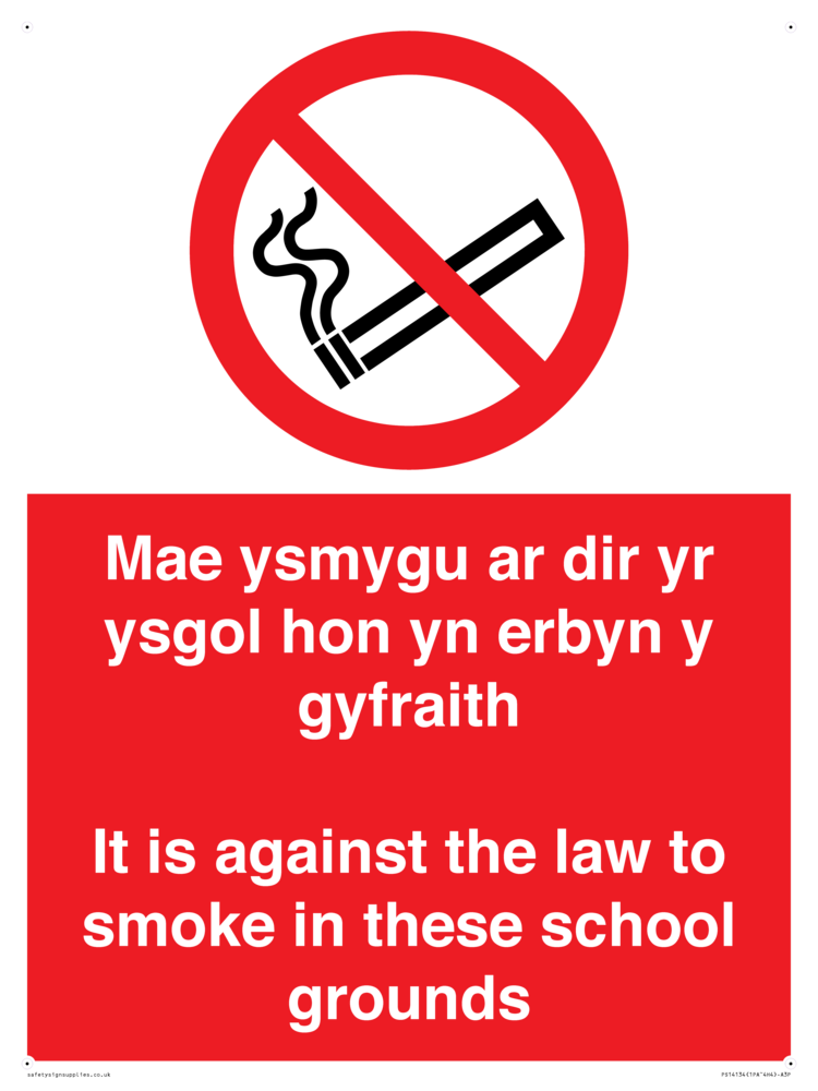 Mae ysmygu ar dir yr ysgol hon yn erbyn y gyfraith It is against the law to smoke in these school grounds - Bilingual Welsh / English