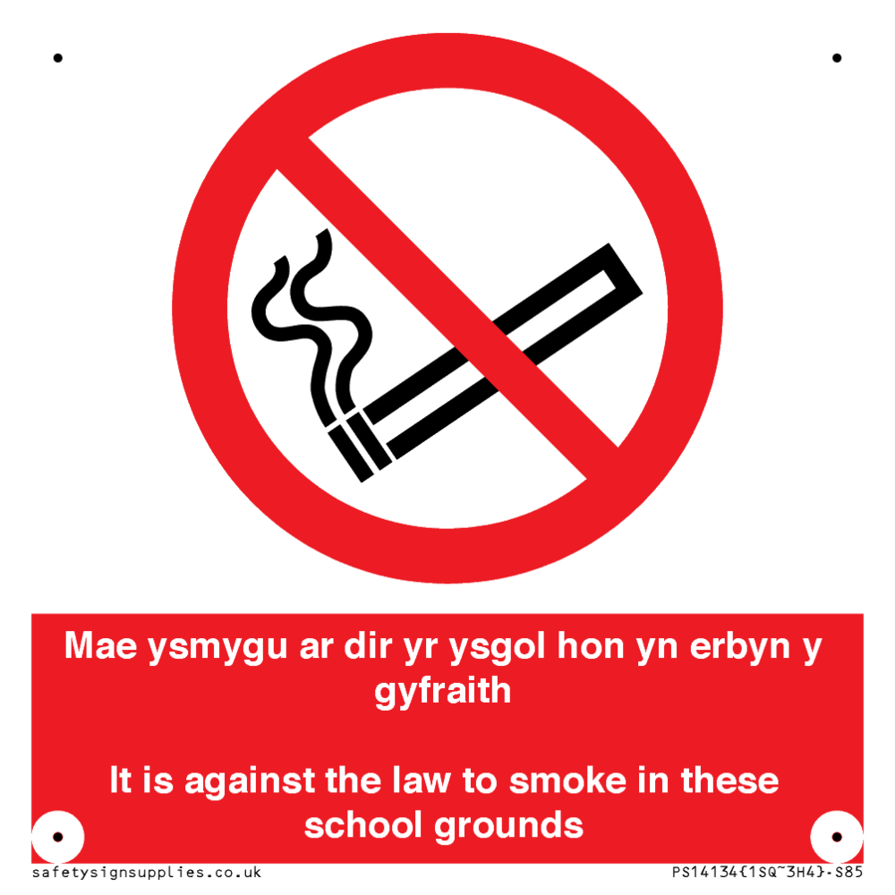 Mae ysmygu ar dir yr ysgol hon yn erbyn y gyfraith It is against the law to smoke in these school grounds - Bilingual Welsh / English