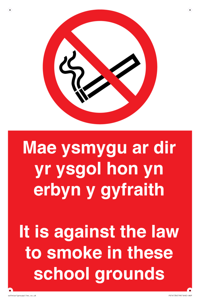 Sign Text: Mae ysmygu ar dir yr ysgol hon yn erbyn y gyfraith It is against the law to smoke in these school grounds