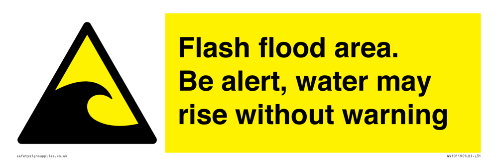 Sign Text: Flash flood area. Be alert, water may rise without warning